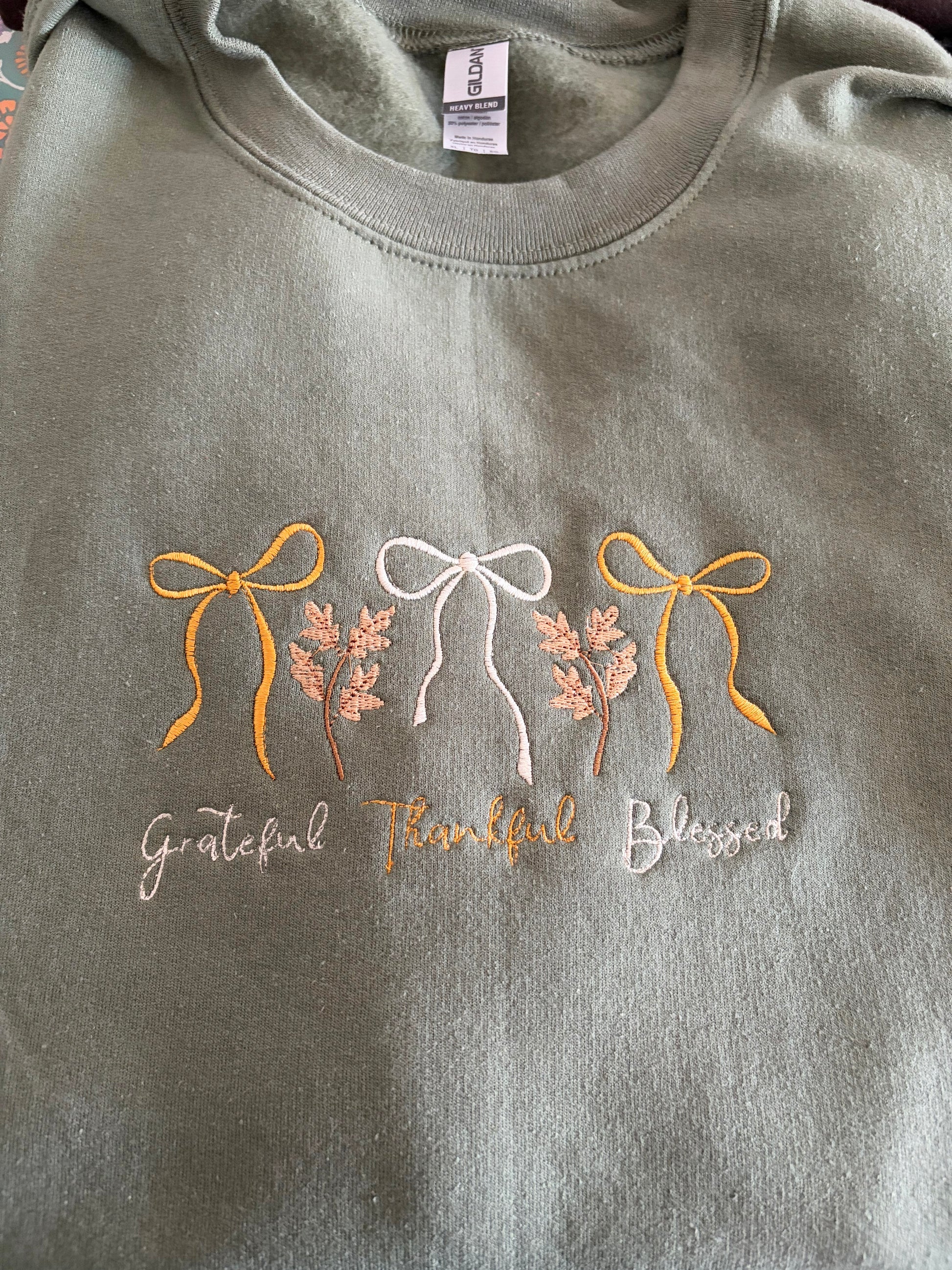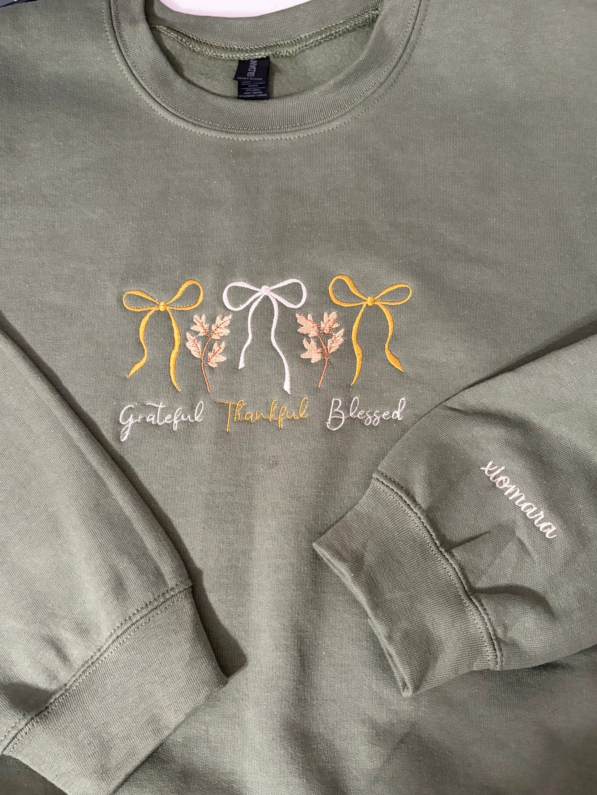 Crafted on a rich forest green sweatshirt, this design features delicate embroidered bows and the words “grateful, thankful, blessed” stitched with care for a timeless, handcrafted look.