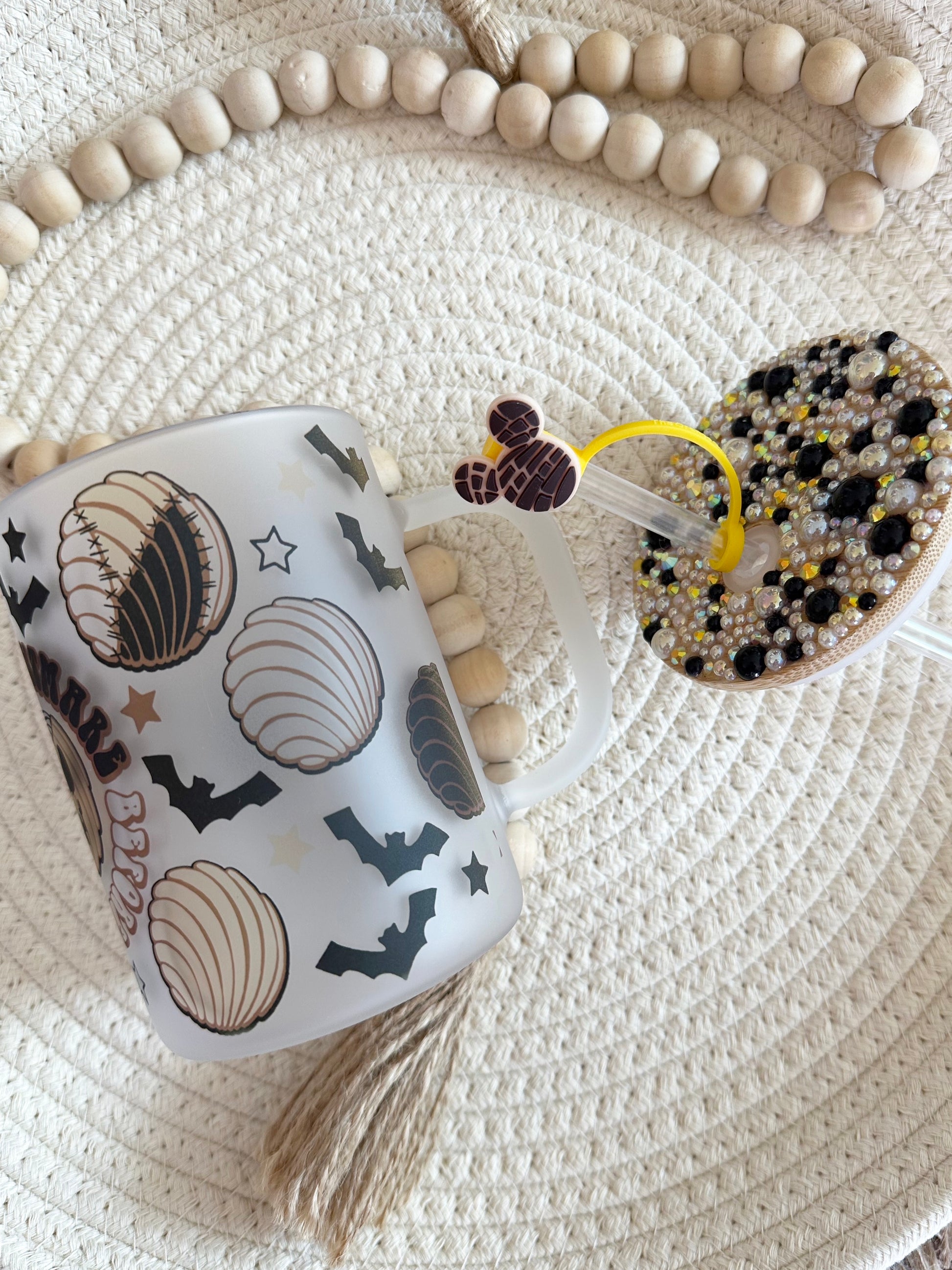 15oz frosted sublimated mug. Includes bamboo bling lid and plastic straw with topper